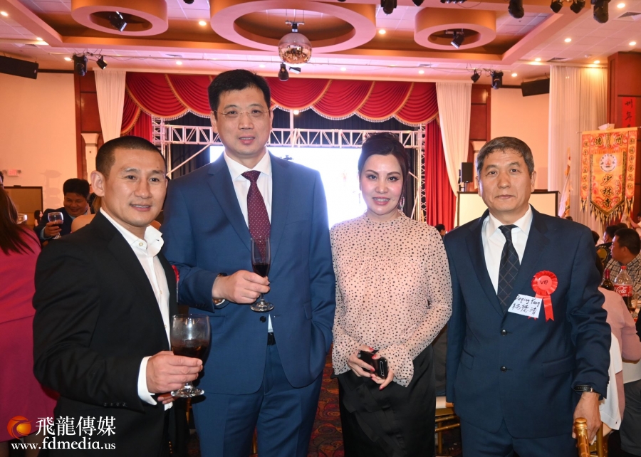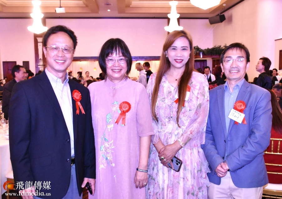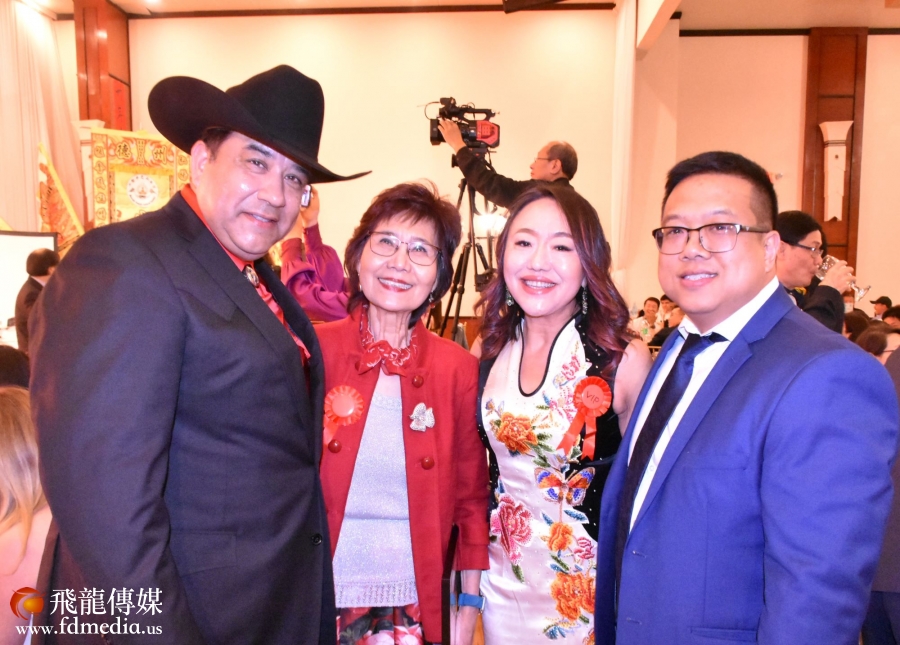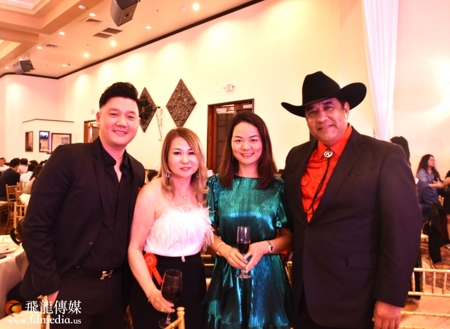 晚会赞助商著名企业家、地产投资人Serene Wong(左二)与团队帅哥、及地产投资人Sandy Xu、第五区法官以色列.加西亚(lsrael B. Garcia, Jr. )合影。
