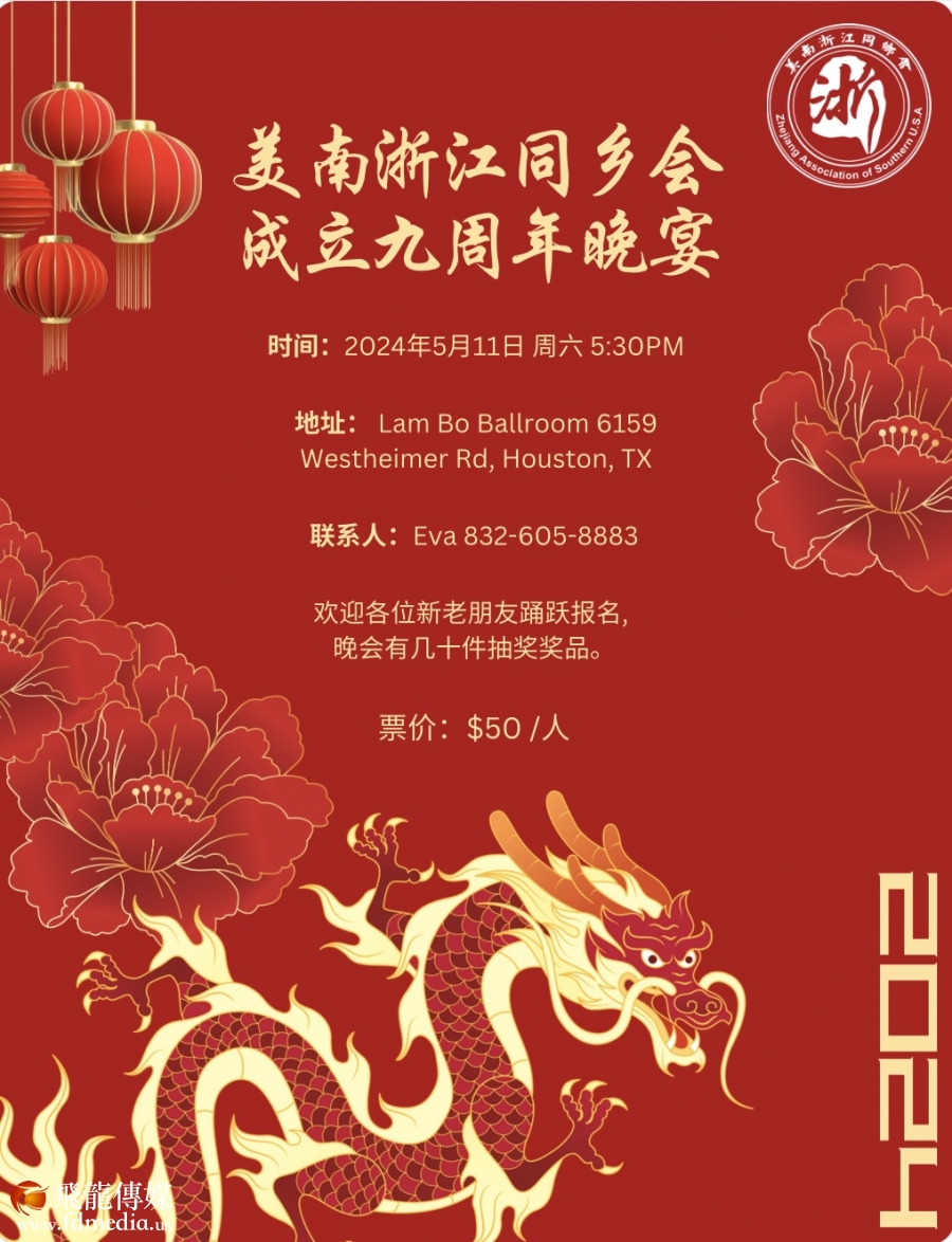 美南浙江同乡会即将迎来盛大的九周年年会,定于五月十一日(周六)举行!诚挚地邀请各位领导及兄弟社团的大力支持与光临!这将是一个不容错过的绝佳机会!
