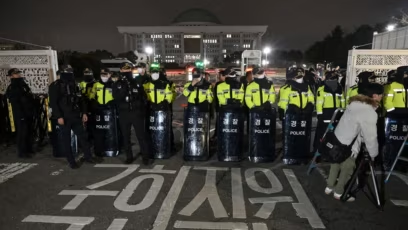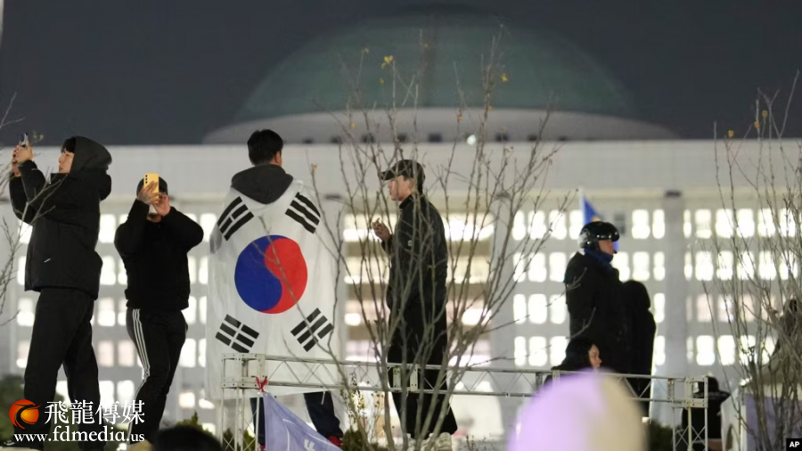 数千韩国民众涌至国会大楼外,举行了总体上和平的示威活动,要求解除戒严令。偶有民众与戒严警察发生肢体对抗。