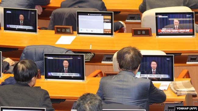 韩国国会议员在首尔国会大楼主会议厅观看总统尹锡悦宣布解除戒严的新闻直播画面。(2024年12月4日)