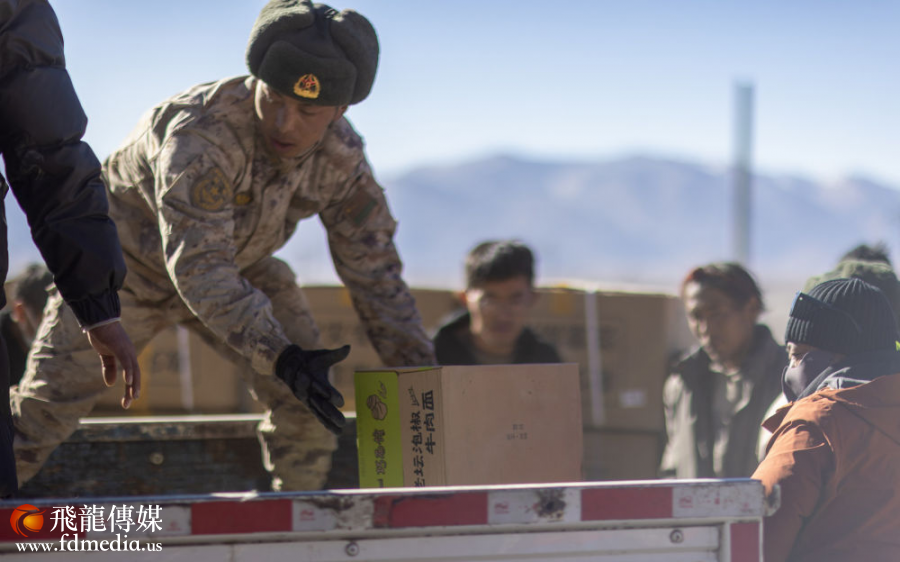 2025年1月8日,解放军战士在定日县尼辖乡雪龙村帮助受灾群众搬运生活物资。新华社记者 姜帆 摄
