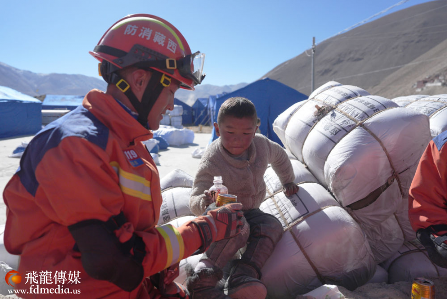 2025年1月8日,在定日县措果乡塘仁村安置点,消防救援人员和小朋友互动。新华社记者 晋美多吉 摄