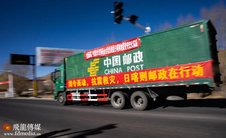 2025年1月8日,在日喀则,中国邮政的抗震救灾物资运输车辆向震中方向驶去。新华社记者 丁增尼达 摄