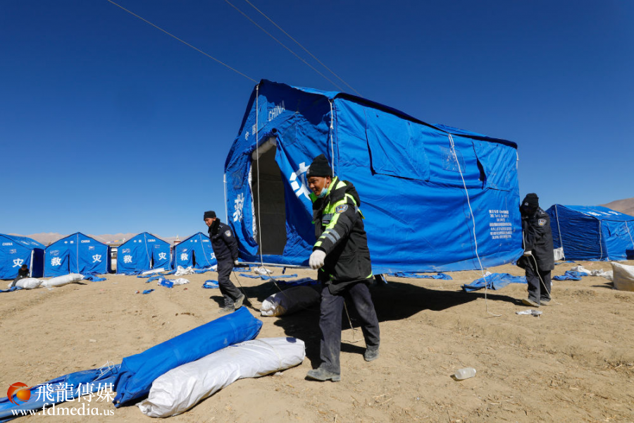 2025年1月8日,在日喀则市定日县措果乡雪珠村安置点,救援人员帮助受灾群众搭建帐篷。新华社记者 沈伯韩 摄