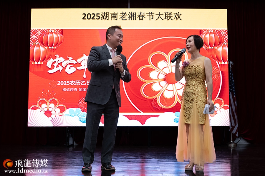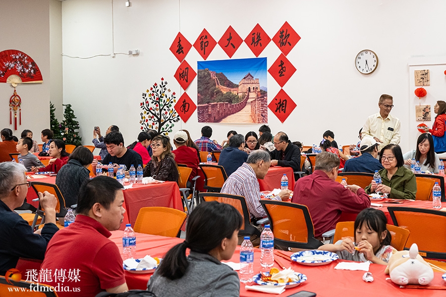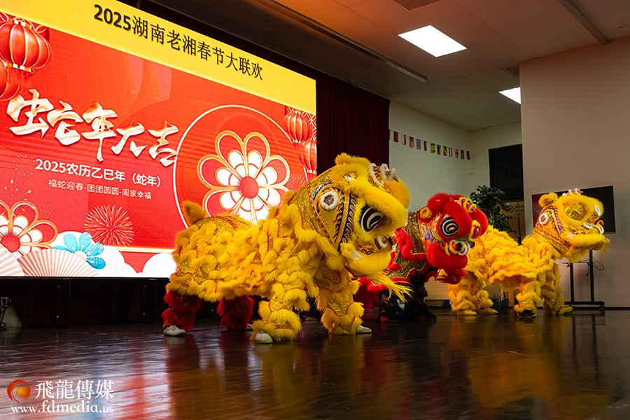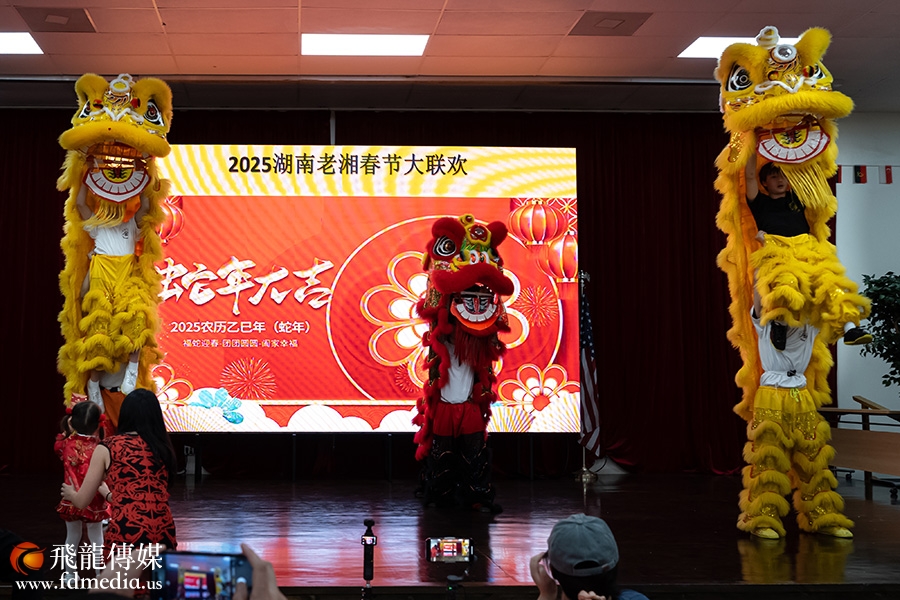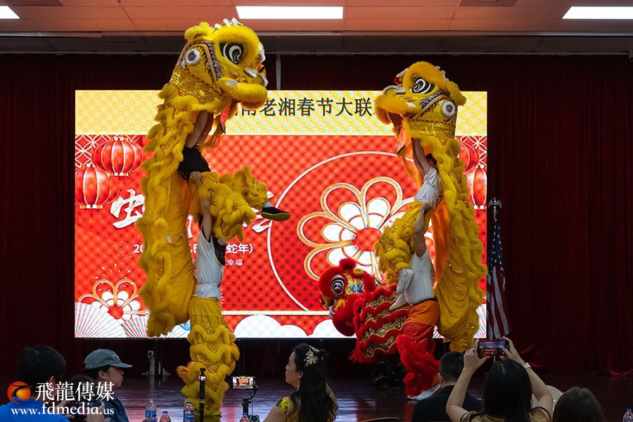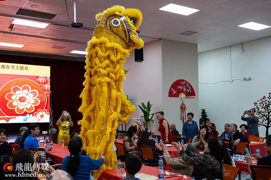 2月8日晚的美福阳光中心大厅一片辣椒红。一百多位休斯顿的湖南老湘亲齐聚一堂,在湘音湘味和欢笑中开启了蛇年休斯顿湖南同乡会湘味湘情春节大联欢。民以食为天。休斯顿湖南同乡会一贯将鉴赏湘味填饱肚子放在第一位。待所有人吃饱喝足,辣出汗来之后,少林寺文化中心的舞狮锣鼓正式敲响。三只狮子穿梭于舞台和饭桌之间,吃下了不少红包。