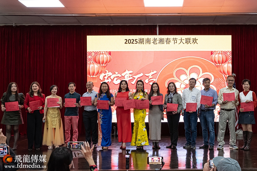 今年是休斯顿湖南同乡会的换届之年。会长廖贻助卸任,由陈亚萍接任新会长。陈亚萍在就职致词中对前任会长们的贡献表达了感谢,并表示将不负老湘们的期望,为乡亲们提供更多贴心的服务与精彩的活动,让大家在异国他乡也能感受到浓浓的乡情。新任会长陈亚萍向卸任会长廖贻助颁牌致谢并和赞助商,理事们合影,感谢赞助商的赞助和理事的付出和服务。原籍湖南的斯坦福市议员谭秋晴也上台致词,并向当晚会场年纪最长的老人家发了红包。湘二代们随后也登台领取了红包。
