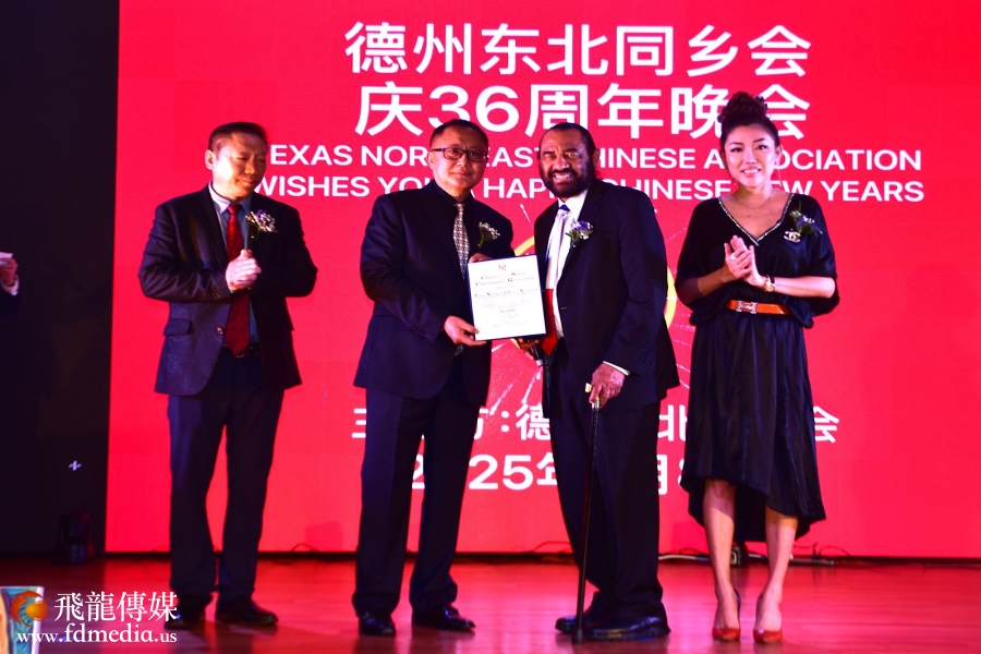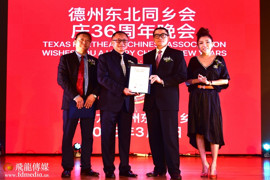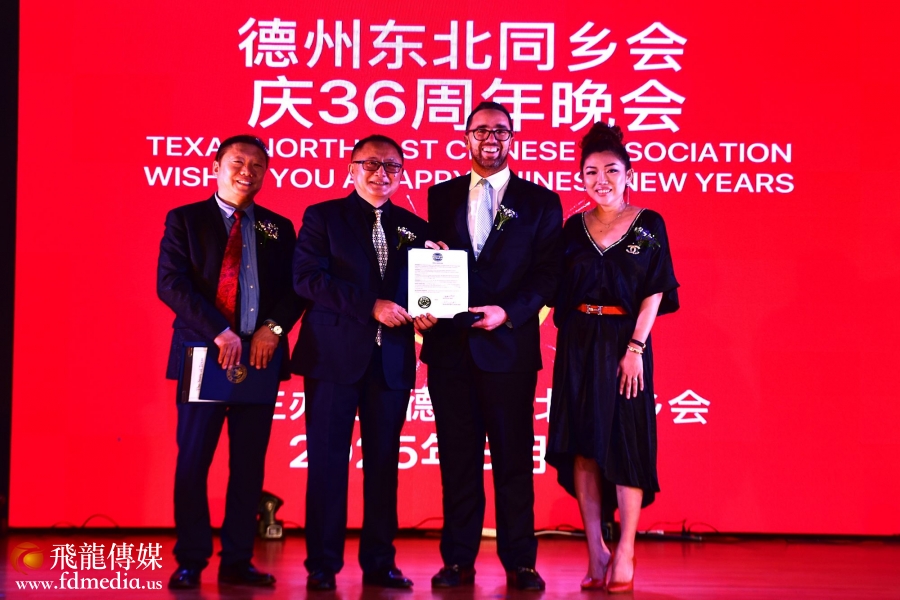 国会议员格林(Al Green)致辞并带来褒奖状!会长钱广明、常务副会长Victoria Powers、常务副会长Jeff Gu上台领奖 。