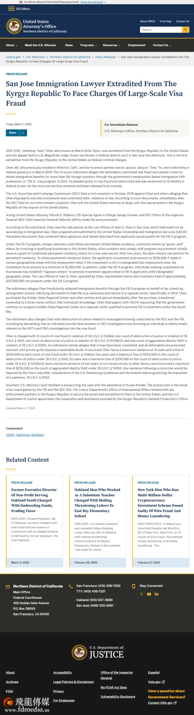 根据起诉书指控,陈丹虹向美国公民及移民服务局(USCIS)提交虚假文件,其中包含伪造签名与不实资讯,借此误导移民局认定申请人符合EB-5投资移民计划资格。