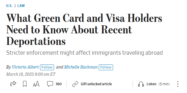据WSJ网站3月20日报道 近期,美国发生多起引发关注的逮捕和驱逐事件,令持有签证和绿卡的移民感到不安。他们担心自己可能成为川普政府加强移民执法的目标。