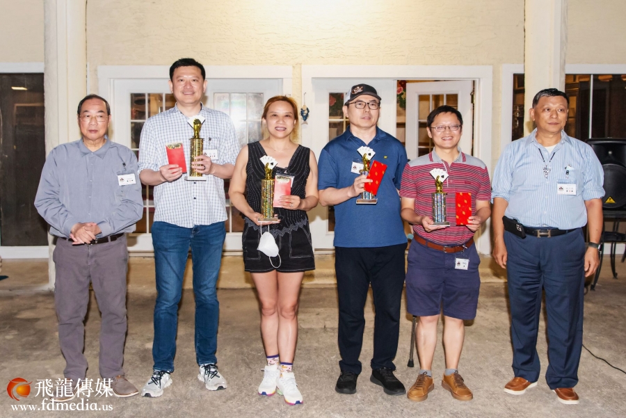 美国竞技扑克牌协会(USPTA)理事长杨万清和顾问陈灼刚为陈铁梅与陆峻组成的“王炸队”冠军组颁奖。