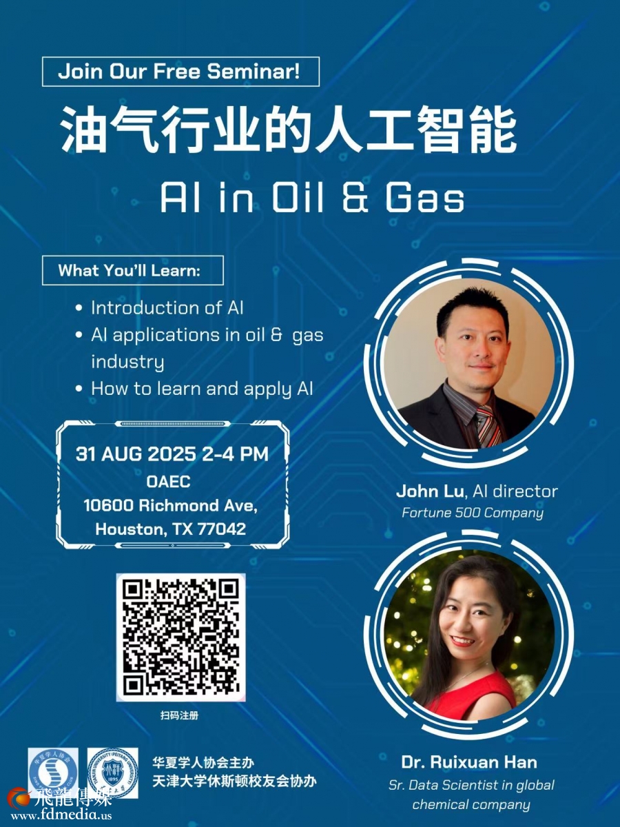 华夏学人协会将于8月31号下午2点至4点举行关于AI的知识讲座。讲座由财富500强公司AI部门负责人陆峻和化工企业的资深数据科学家韩睿璇博士共同主讲。讲座将会以油气化工行业为例探讨AI的发展以及对相关工作的影响。议题包括:AI将会影响到公司里哪一类的工作?哪些领域将会因AI而受益? 在AI兴起的当下,求职人员该如何准备自己?新入职的人员又该如何调整自己?资深员工如何应对和驾驭AI带来的挑战与机遇等等。