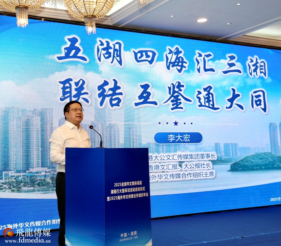 李大宏表示,今年是中國人民抗日戰爭暨世界反法西斯戰爭勝利80周年,民族危亡之際,海外華媒不畏危難,將中國抗戰的消息帶到世界各地,講述着中華民族不甘屈服的抗戰精神,如今我們接過歷史的接力棒,仍要賡續守護紅色記憶、傳遞抗戰精神的使命,要用更鮮活的敘事、更創新的形式,讓年輕一代讀懂歷史、銘記初心,把中國尊重歷史、珍愛和平的態度傳遞給世界。他表示,大文集團與海外華文傳媒合作組織願以此次湖南年會為新起點,與湖南深度交流合作、常來常往,共同推動文明傳播與交流互鑒,讓每一條湖南聲音、中國故事都能跨越山海、永續迴響。