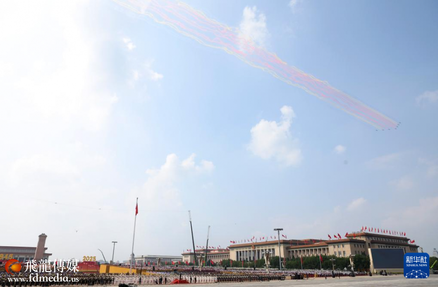 9月3日,纪念中国人民抗日战争暨世界反法西斯战争胜利80周年大会在北京隆重举行。这是教练机梯队飞过天安门广场上空。新华社记者 杨磊 摄