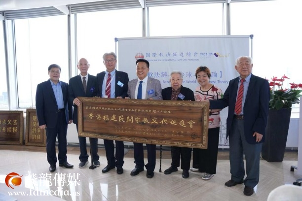 國際軟法座談會—幸福論,會上陳建輝主席與陳勇生會長共同贈予“香港福建民間宗教文化促進會”牌匾;左起:楊流昌會長、施學概大師、陳建輝主席、陳勇生會長、胡仙博士、林廣兆會長