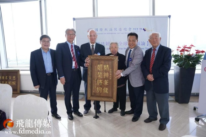 國際軟法座談會—幸福論,會上贈送施學概大師牌匾;左起:楊流昌會長、陳建輝主席、施學概大師、胡仙博士、陳勇生會長、林廣兆會長合影。