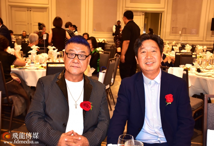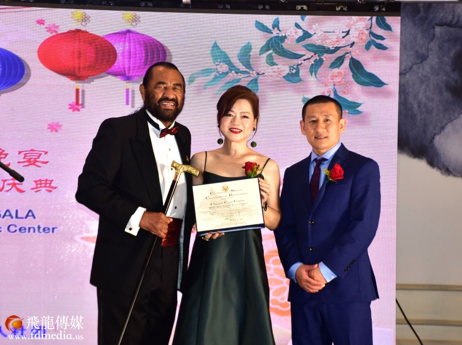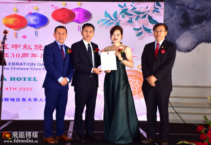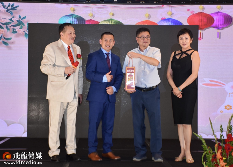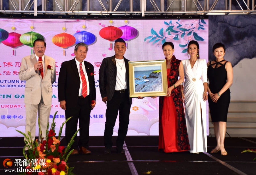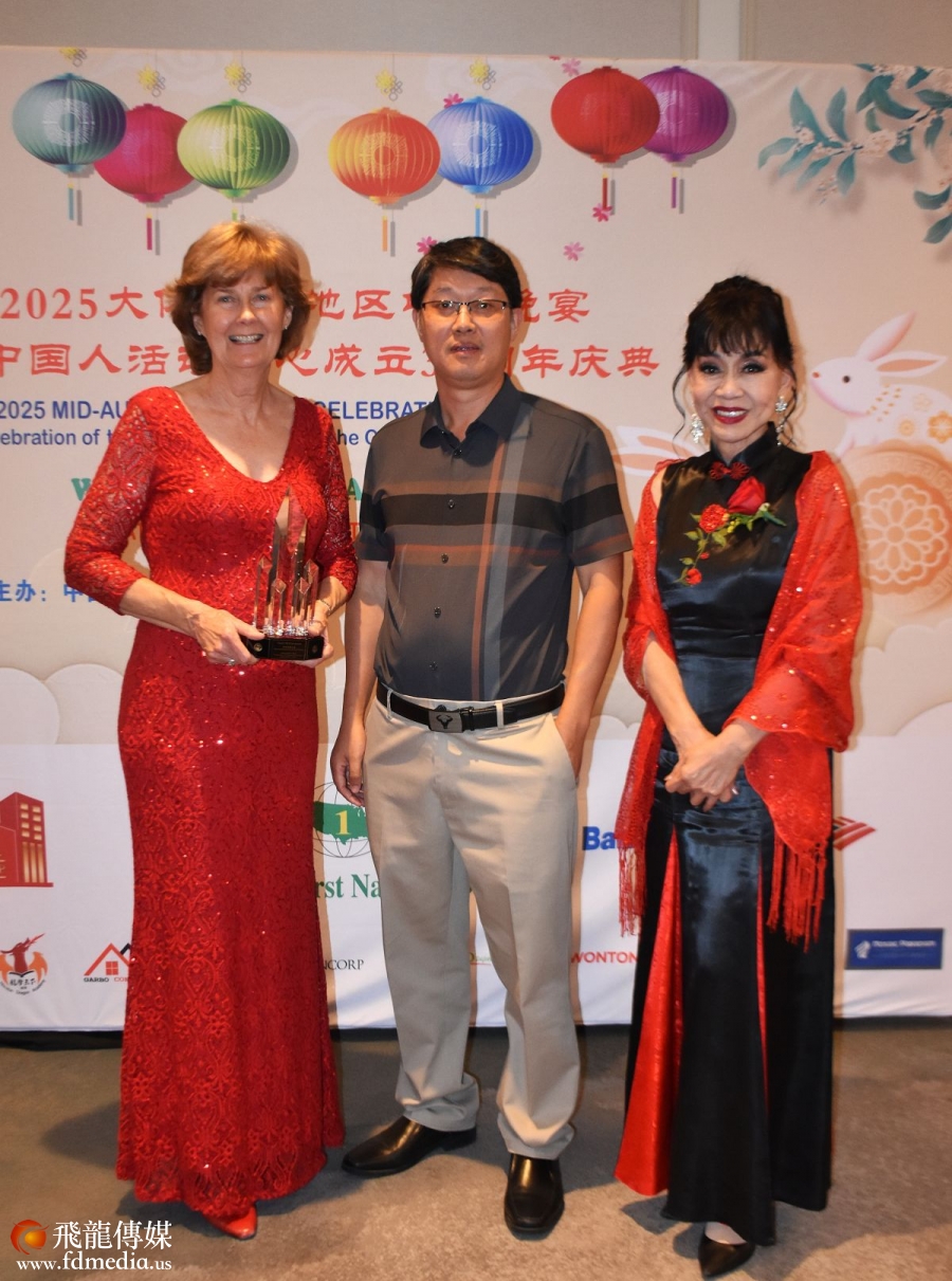 晚宴主席刘根明、中国人活动中心董事长范玉新、执行长陈皙晴上台接收贺涵。