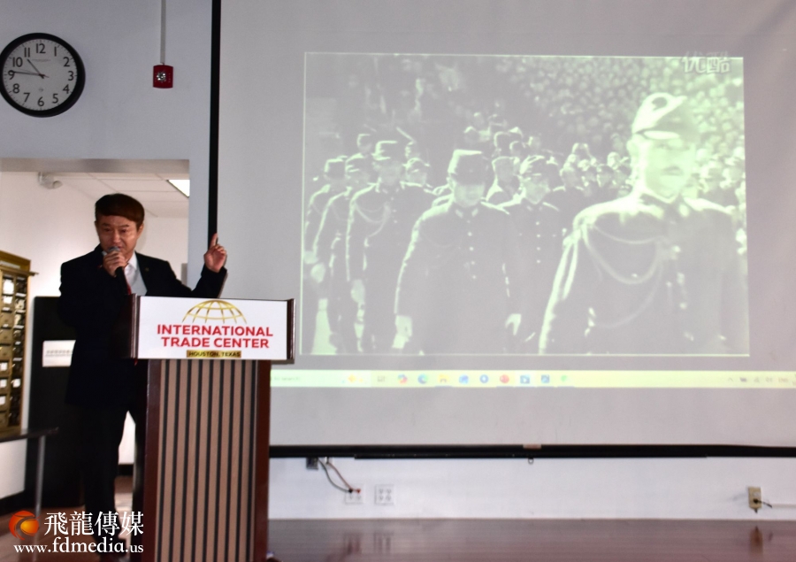 德州兩岸時事論壇社副社長浦浩德博士以圖片和視頻的方式,回顧了抗日戰爭十四年的艱苦歲月。他強調,正是因爲中國在抗擊法西斯戰爭中的巨大犧牲和勝利,才得以被廢除一千多條不平等條約,以及被廢止從1870年到1945年長達75年、臭名昭著的《排華法案》。在播放了1945年北平受降儀式的紀念視頻後,他提醒要深深認識台灣的命運與祖國的命運緊密項鏈、休戚相關。他呼籲團結起來,實現中華民族的偉大復興,這樣才能給包括台灣同胞在內的全體中華兒女帶來安全、尊嚴和自立於世界民族之林的榮耀。