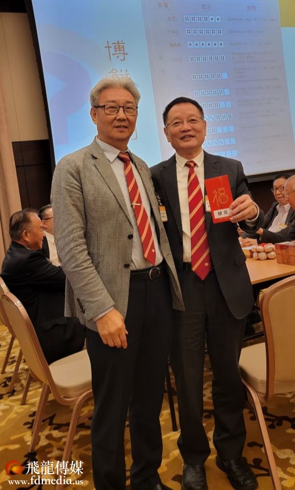 2025年9月中華總商會東區委員會中秋節博餅活動中,陳建輝會董(左)與邱建新常董(右)博到狀元合影