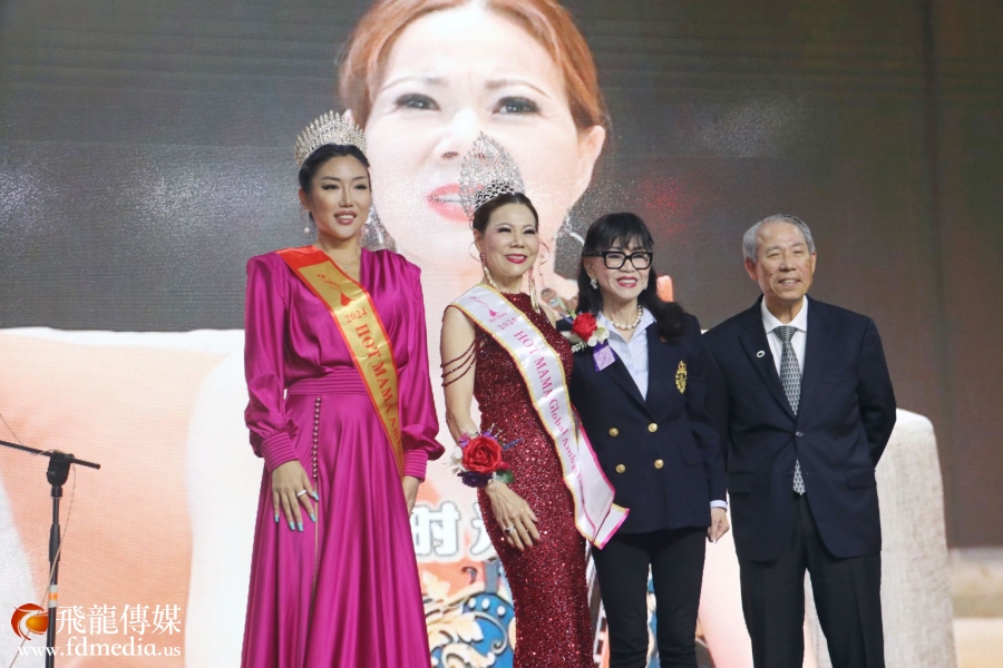 图为:2024 HOT MAMA 形象大使Victoria Powers 、斯坦福副市长谭秋晴、恒丰银行总裁张永男共同为Tina Chang 戴上彰显荣耀的皇冠和绶带。