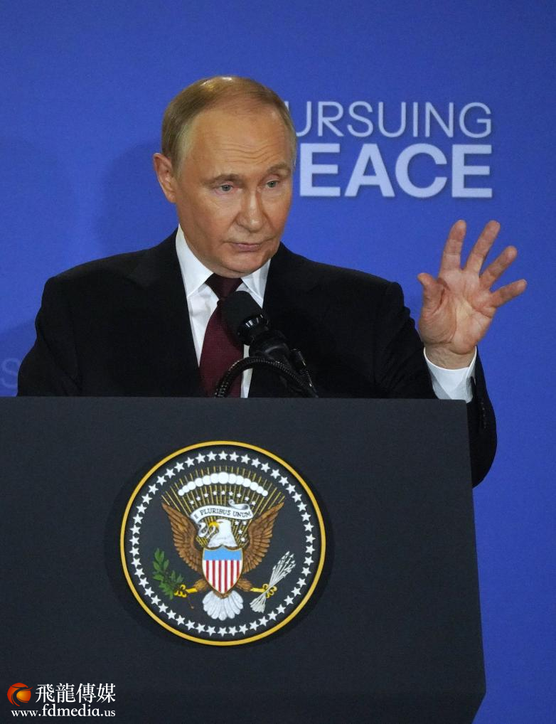 8月15日,俄罗斯总统普京与美国总统特朗普(未在画面中)在美国阿拉斯加州安克雷奇市埃尔门多夫-理查森联合军事基地举行会晤后共同出席联合记者会。新华社记者吴晓凌摄